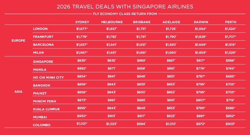 *Conditions apply. Offer valid until 04 February 2026. Prices are per person in Australian dollars and are correct as at 13 January 2026 but may fluctuate if surcharges, fees, taxes or currency change. Agents may charge service fees, rates vary. Prices displayed are from pricing, includes all prepaid taxes and fees, except payment card fees which may be payable in addition, rates vary. Prices displayed are based on the departures dates as displayed. Alternate travel dates are subject to a seasonal surcharge. Day of week surcharges, flight restrictions and blackout dates may apply. ^KrisFlyer is the rewards programme of the Singapore Airlines Group. Please check all prices, availability and other information before booking. Singapore Airlines terms and conditions and Helloworld Travel online Booking Terms and Conditions apply.